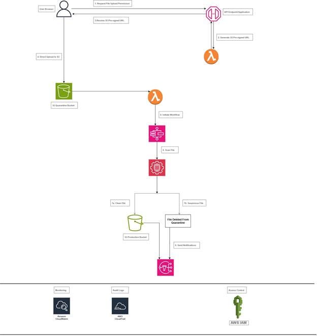 This architecture provides a robust, scalable, and secure file upload system that automatically protects your production environment from malicious files while maintaining a smooth user experience for legitimate uploads.